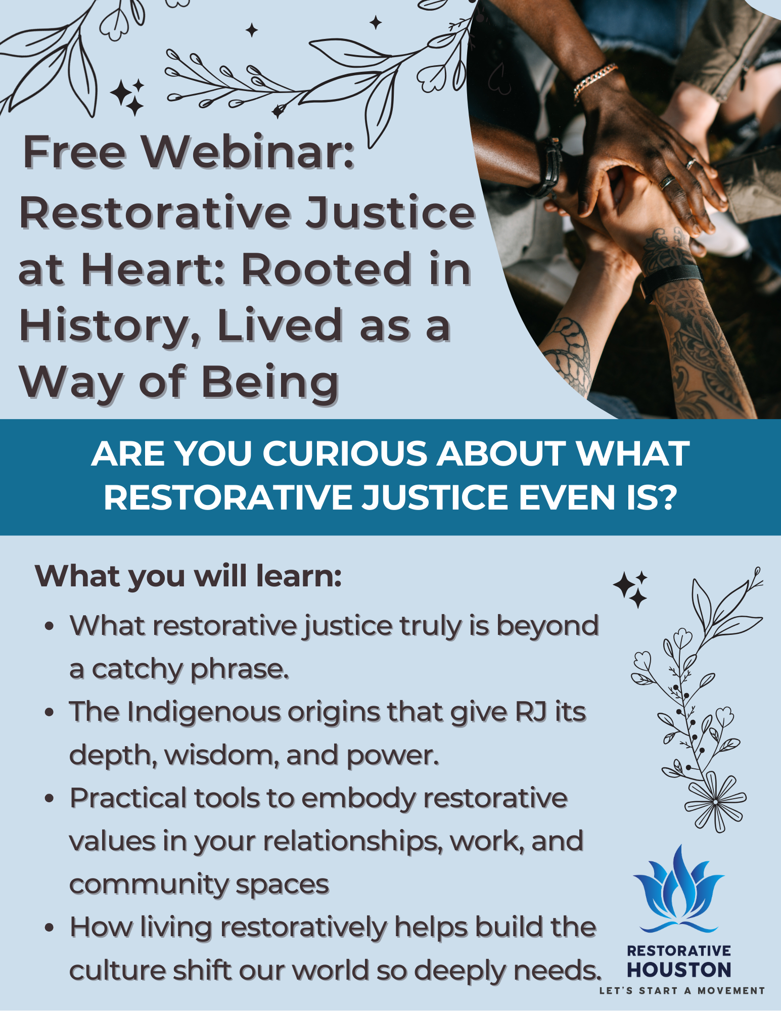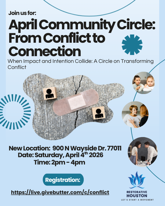 Led by Perla Moreno, Programming & Grants Manager at Restorative Houston, and Rachel Vargas, restorative trainer, facilitator, and researcher, this is a FREE, beginner-friendly webinar exploring the roots and everyday practice of restorative justice.
